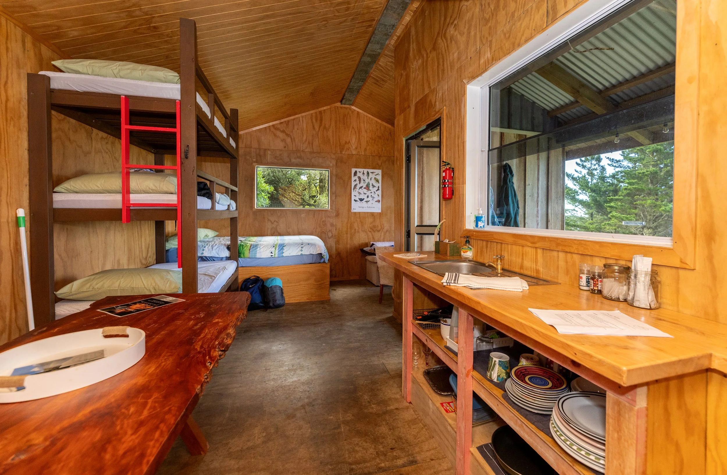 There is no vehicle access, but a one kilometre walk with an elevation of approximately 100 metres, meanders alongside a young Douglas-fir plantation and mature pine forest. During the summer, guests can enjoy eating blackberries whilst listening to the threatened long-tailed cuckoo echoing up the valley. With the Hut being so close to Taranaki Maunga though, guests can expect an occasional dusting of snow too.